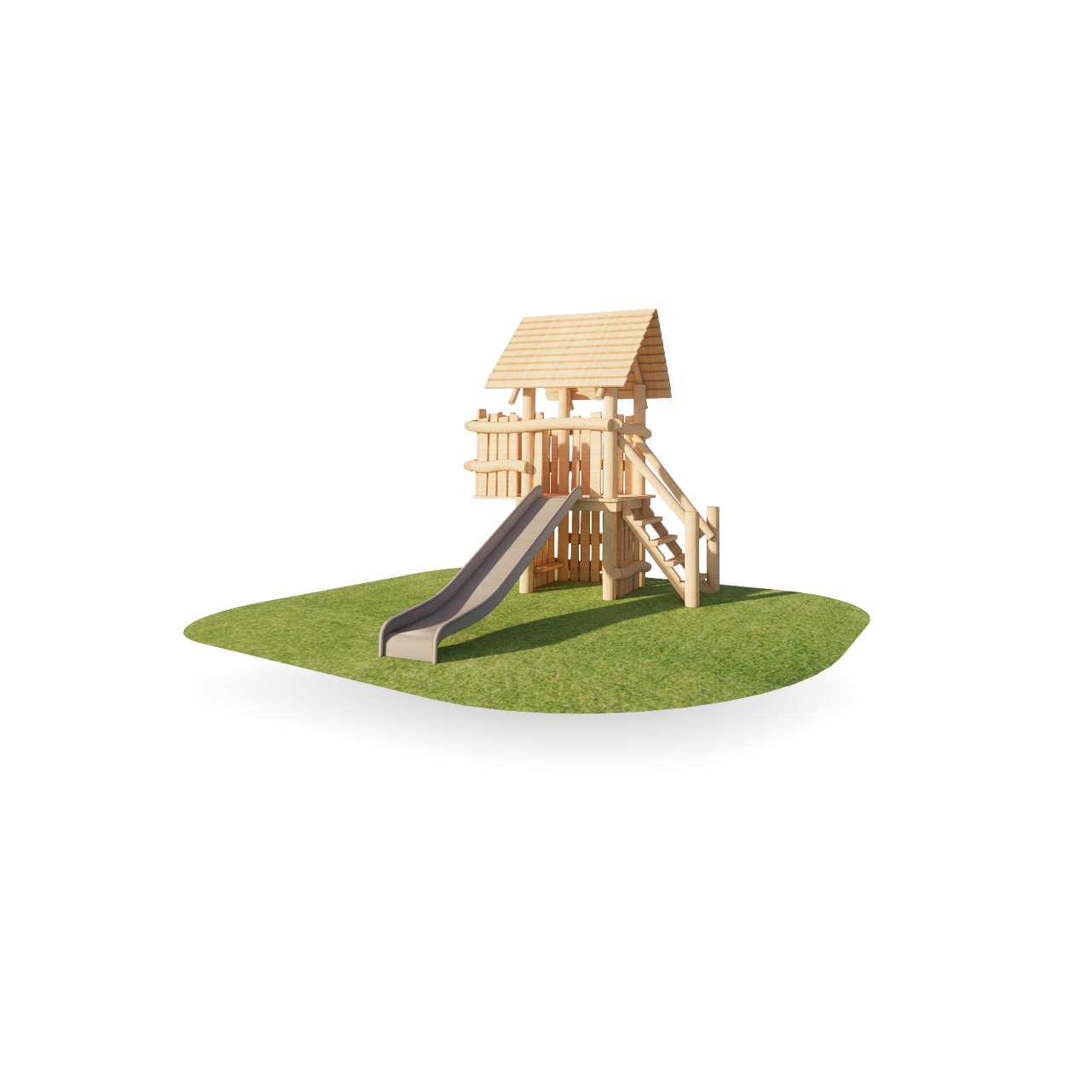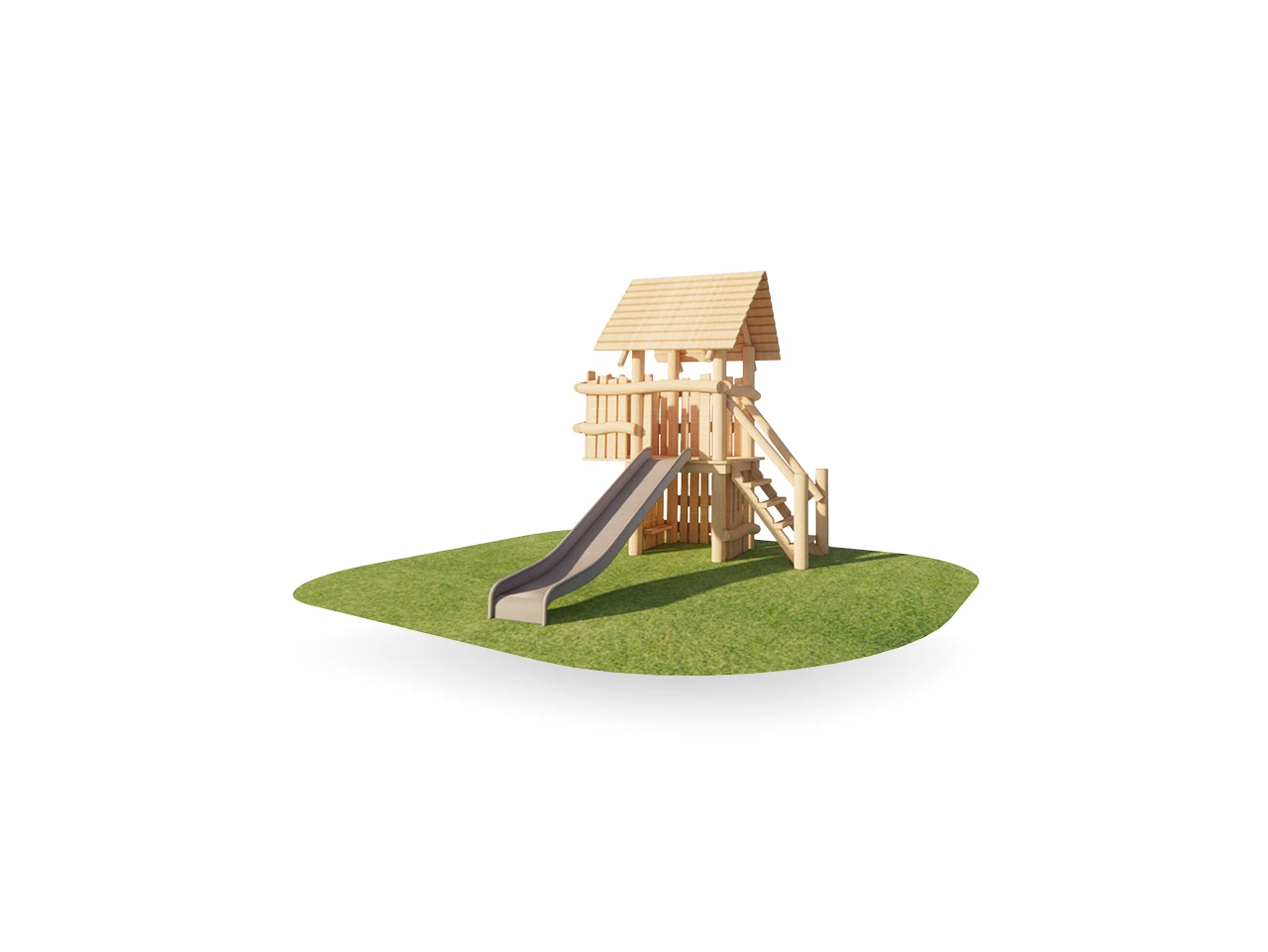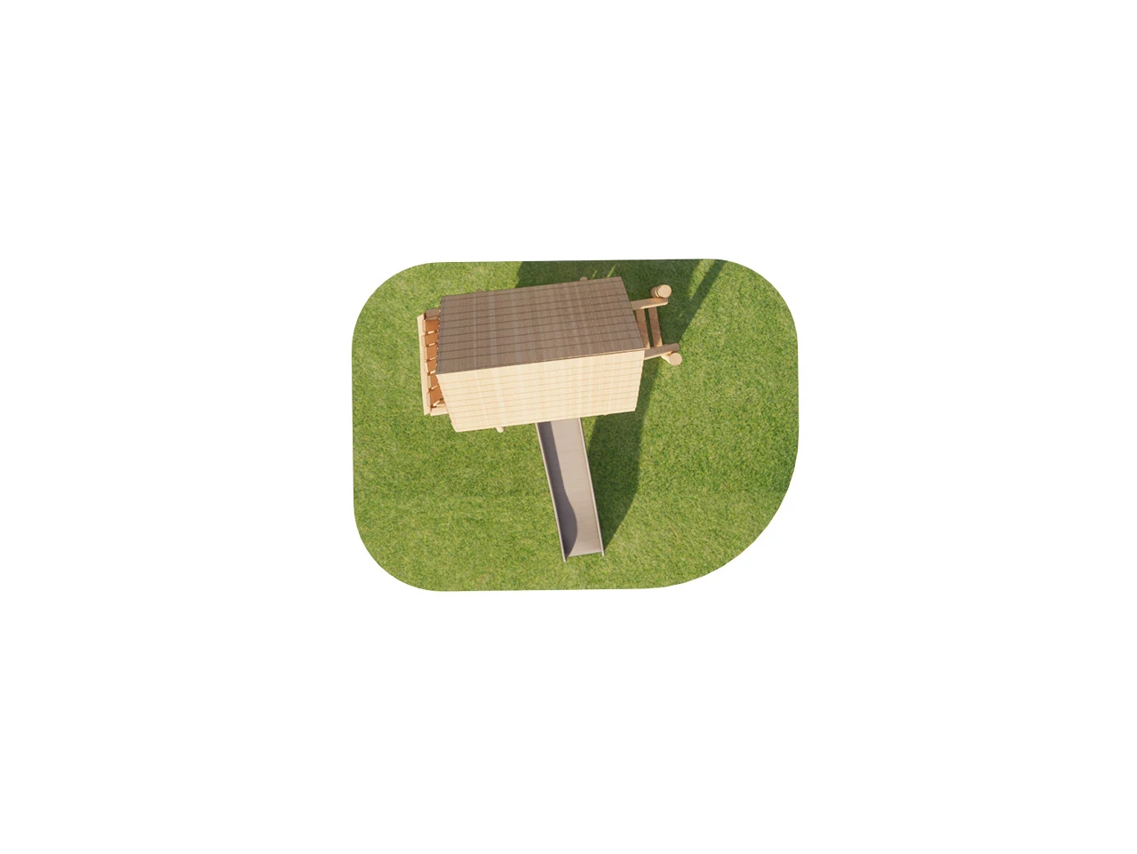 Licht, luchtig en vol fantasie. Een fijn speelhuisje met glijbaan, trap en een klein balkon, waar kinderen klimmen, kijken en hun eigen verhalen verzinnen.