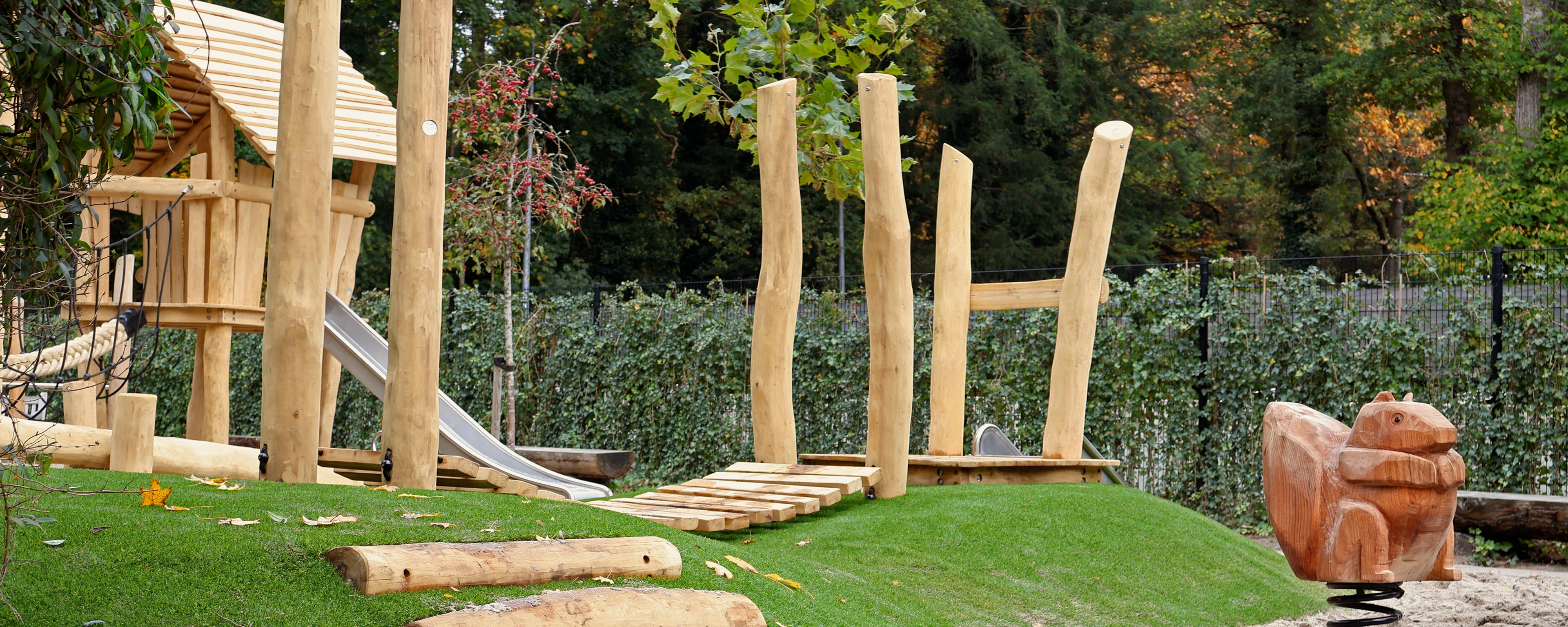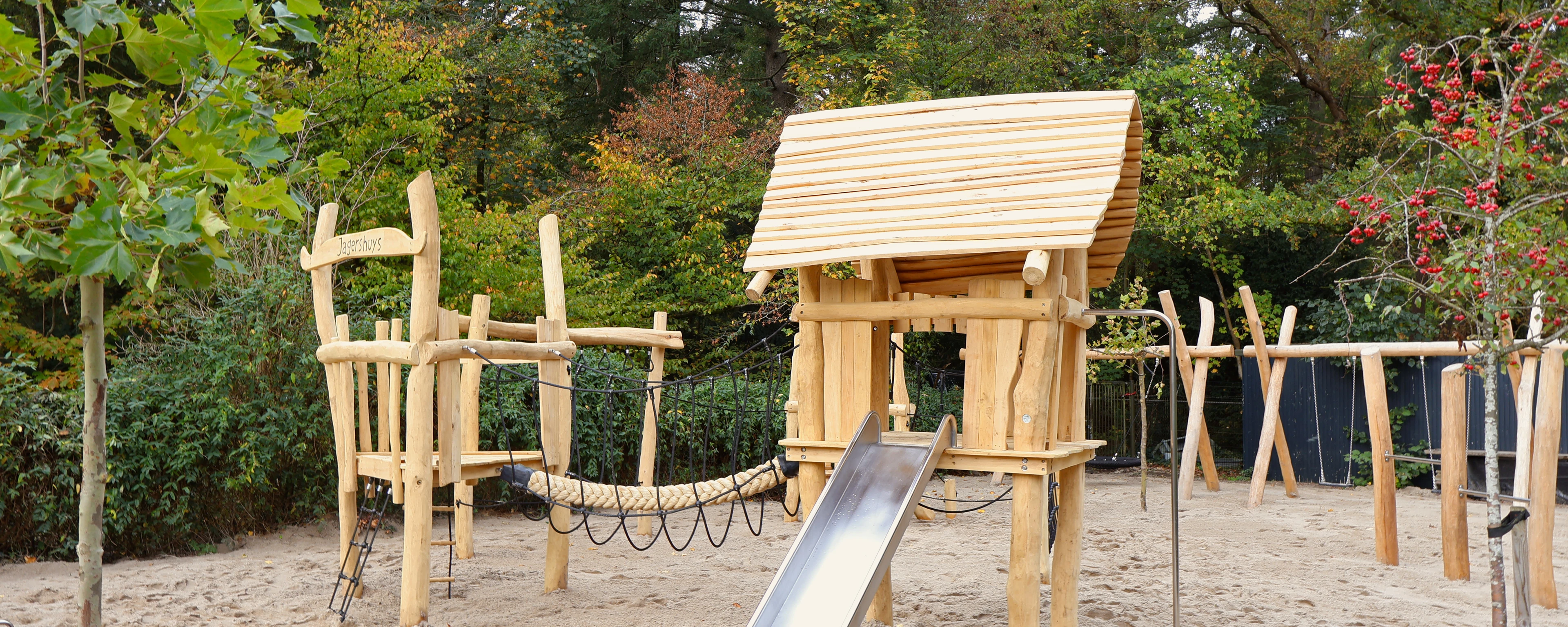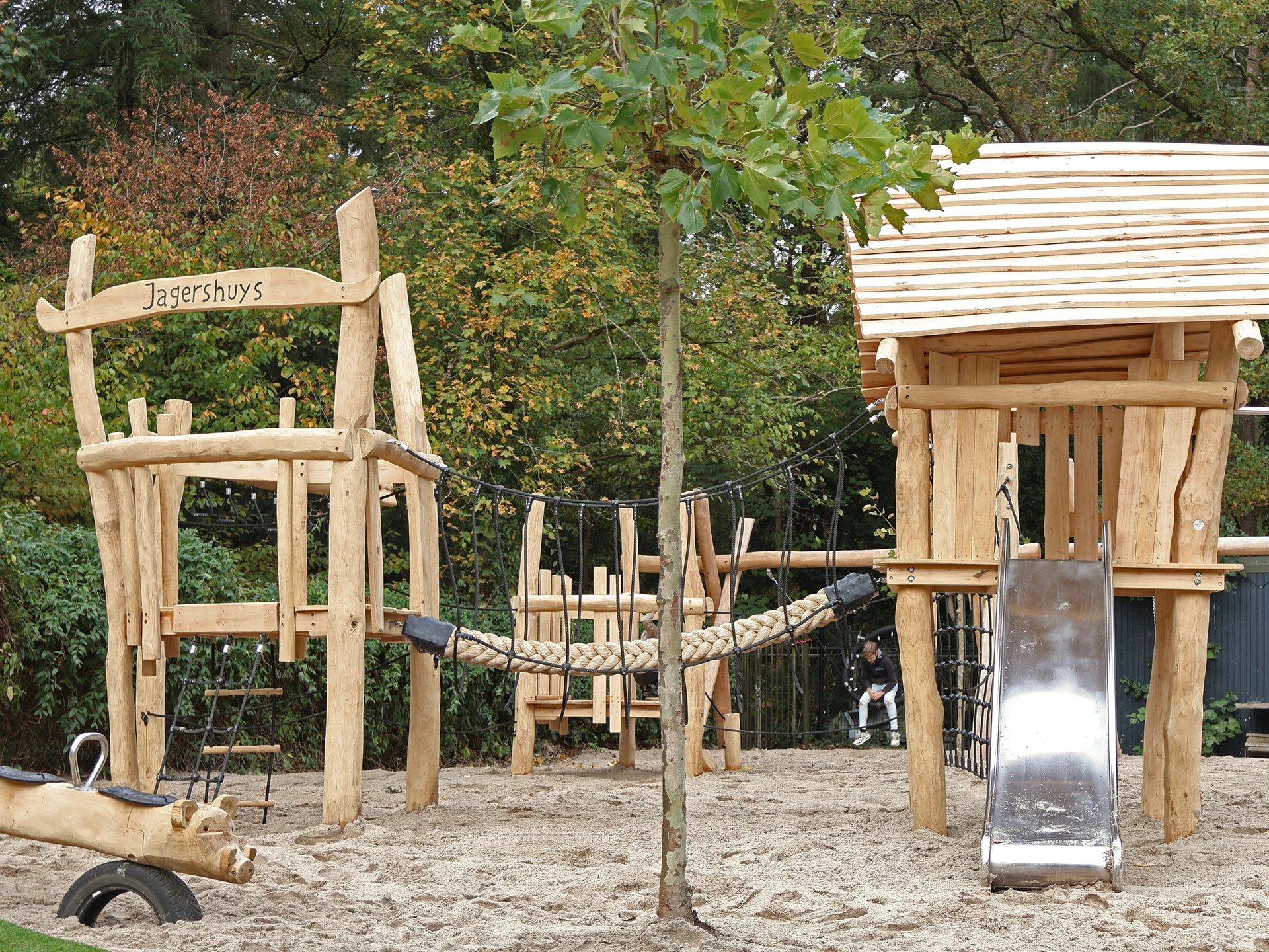 Bij Pannenkoekenhuis Het Jagershuys in Zeist krijgt spelen met hout écht een eigen gezicht. Houten dieren op vrolijke veren zorgen voor beweging bij de kleintjes, terwijl grotere kinderen zich uitleven in een complete speelomgeving met torens, glijbanen, wiebelbrug en klimnetten. Alles uitgevoerd in hout en met oog voor detail en maatwerk. Voor optimaal speelplezier voor kinderen.